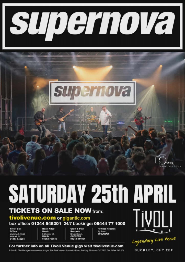“The world’s leading OASIS tribute band SUPERNOVA come to The Tivoli on Saturday 25th April 2026. Having been selected to support the OASIS LIVE’25 shows at Wembley Stadium by playing the official Fan Zone at Box Park, SUPERNOVA have become renowned for their energetic stage performances and a sound that replicates OASIS at their absolute peak. Playing all the greatest hits alongside iconic fan-favourite album tracks, SUPERNOVA deliver both Liam and Noel led classics to a standard surpassing all others. From headlining festivals, selling out shows across the UK and performing at Knebworth Park, SUPERNOVA are the only definitive tribute to one of British music’s most iconic bands. Be. There. Now.”