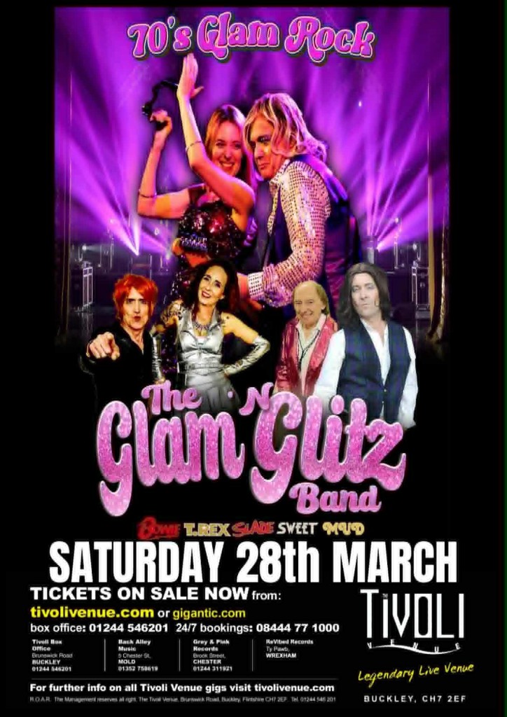 Currently touring and fresh from supporting the legendary MUD on their UK Tour, The Glam ‘N Glitz Band brings the iconic Glam Rock era of the 1970s to life! This high-energy tribute act celebrates the golden age of glitter and grooves, performing hits from legendary icons like David Bowie, T. Rex, Sweet, Slade, and more.